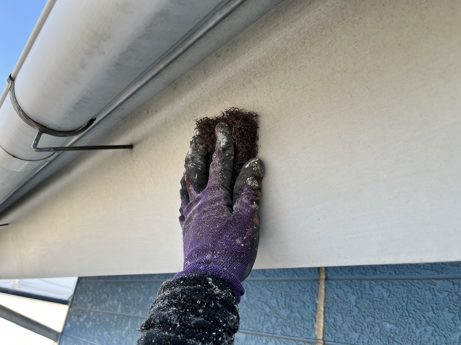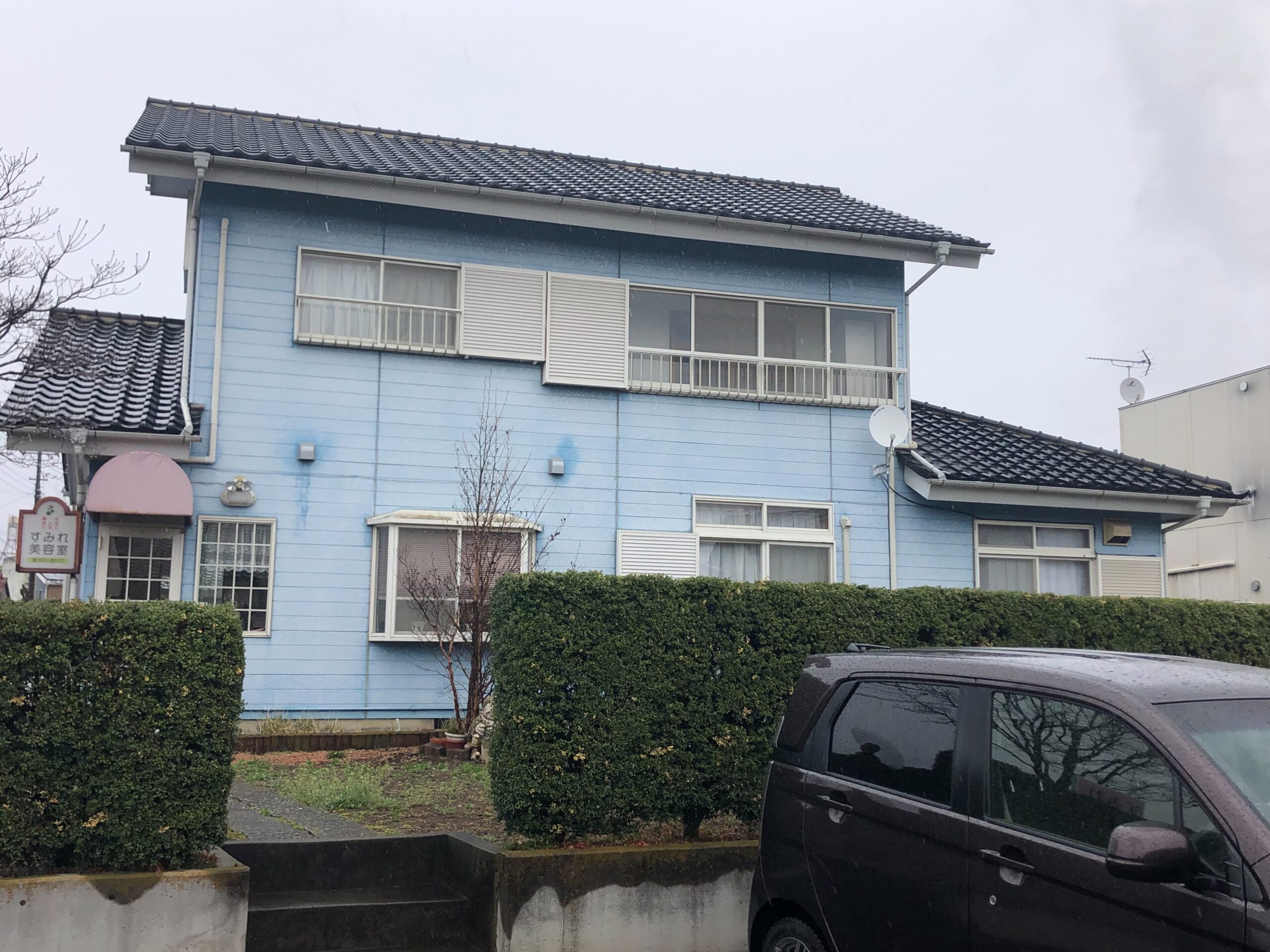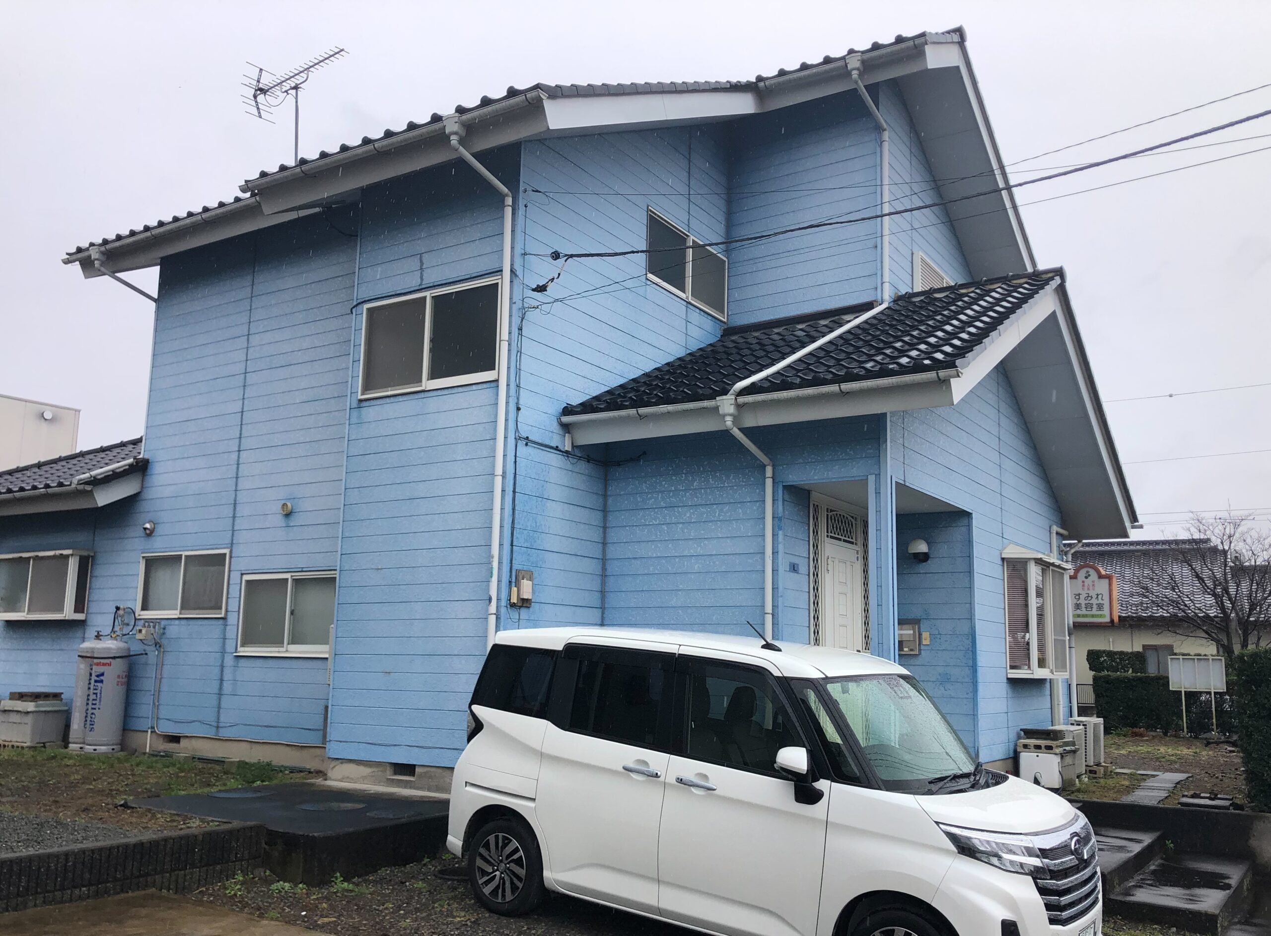 素敵なブルーのお住まいですが、経年による色褪せや色むらがあり、汚れも付着している状態です。